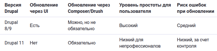 В отличие от предыдущих версий Drupal 8 и 9, где обновления можно было запускать через административный интерфейс, Drupal 11 перенёс процесс обновления полностью в руки профессиональных инструментов — Composer и Drush. Это позволило достичь нового уровня контроля и безопасности при обновлении.