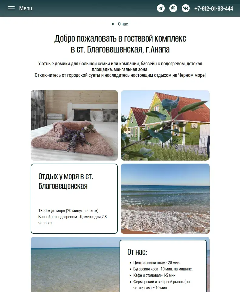 Заказчик Гостевой комплекс в ст. Благовещенской Изображение в кейс Описание работ Создание лендинга для гостевого комплекса в станице Благовещенская, г.Анапа.Сайт создаётся на Тильде и находится в разработке. Сайты, сервисы и магазины под ключ