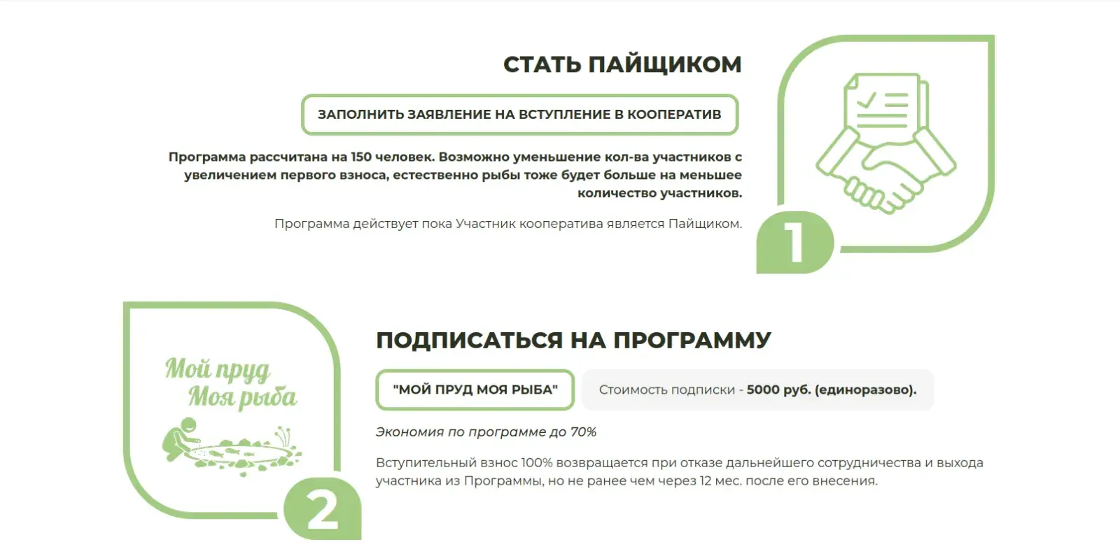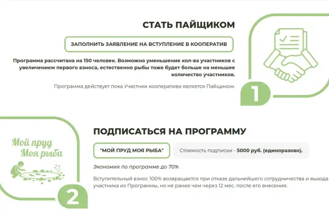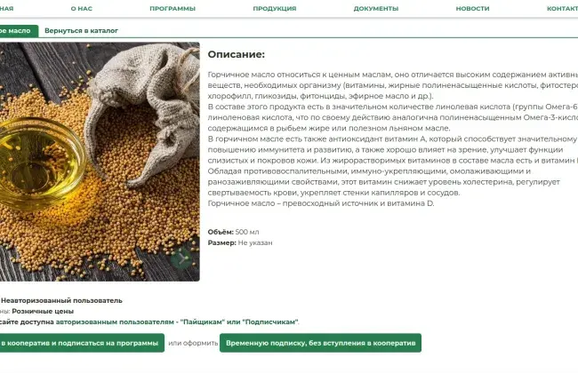 - Разграничение пользователей на ролевые группы, где авторизованный пайщик (подписанный или не подписанный на программу) или временный подписчик может оплатить и отправить заявку с сайта. Анонимный пользователь, либо не подписчик и не пайщик может отправить только заявку на товар, заявление на вступление в кооператив, либо заявление на подписку;
