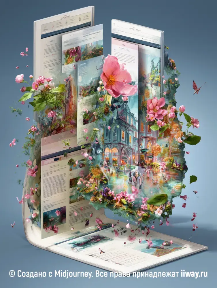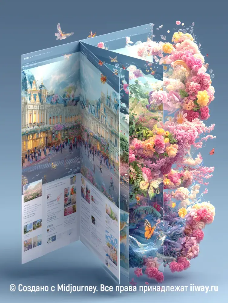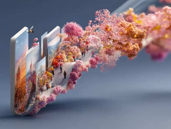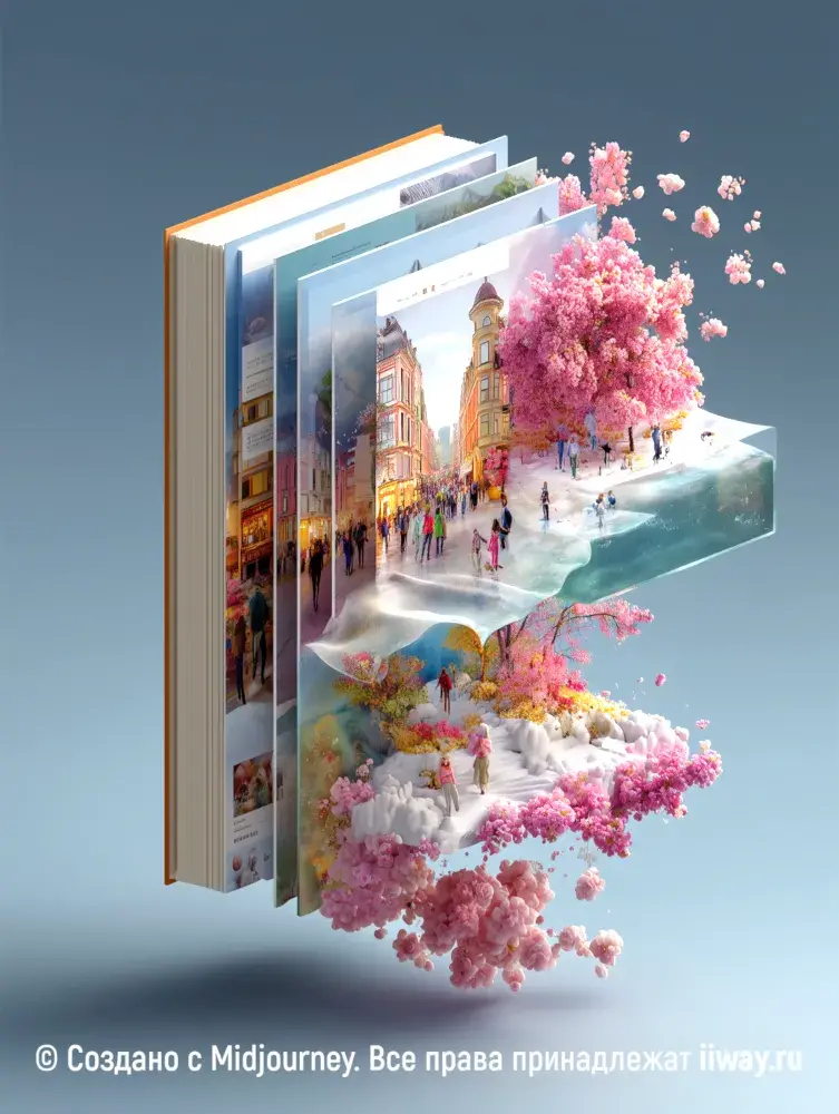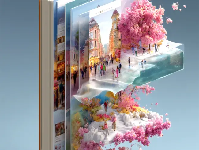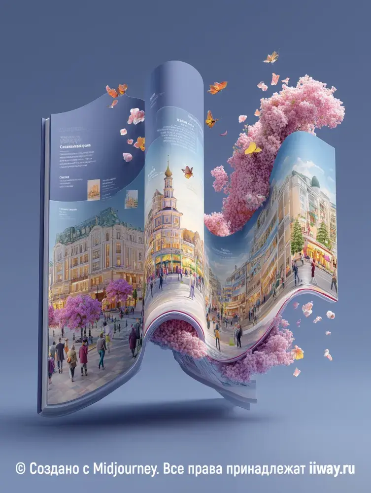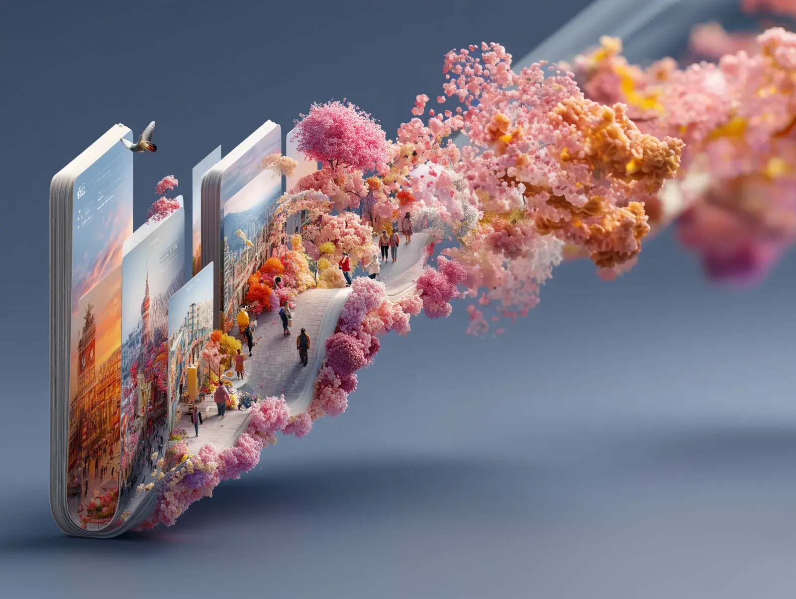 Создать цифровое изображение в виде 3D-открытой книги (монитора, дисплея), страницы которой разлетаются или плавно изгибаются и словно оживают, высвобождая элементы городской уличной сцены и цветочные объекты. Визуализация должна сочетать реалистичные изображения зданий и людей с художественными природными элементами, создавая эффект перехода от плоского изображения к объёмному живому пространству.