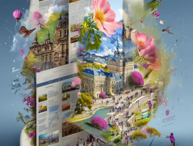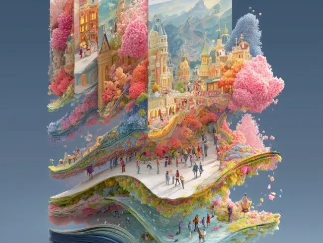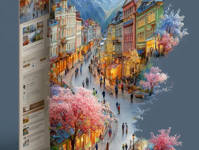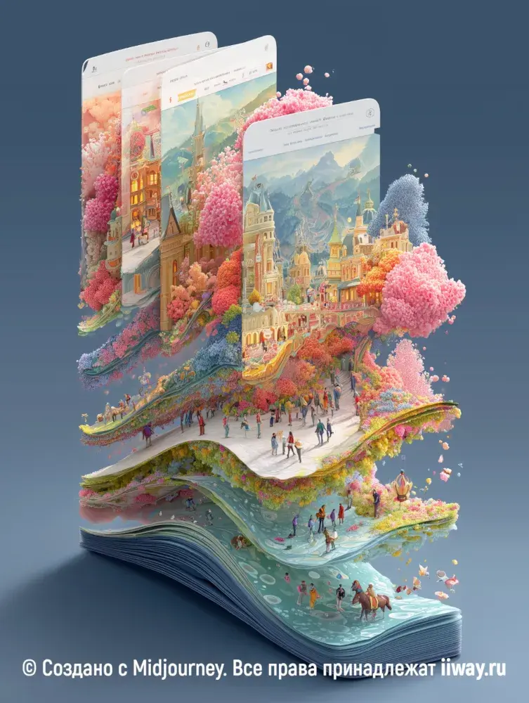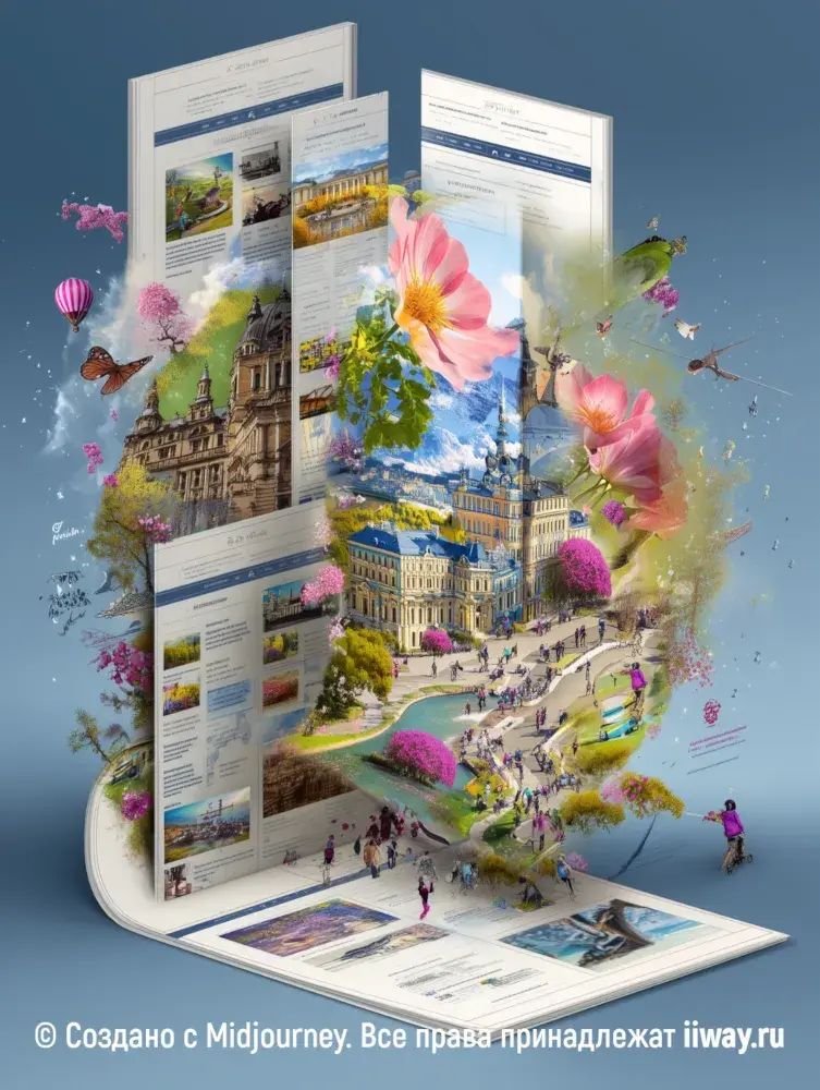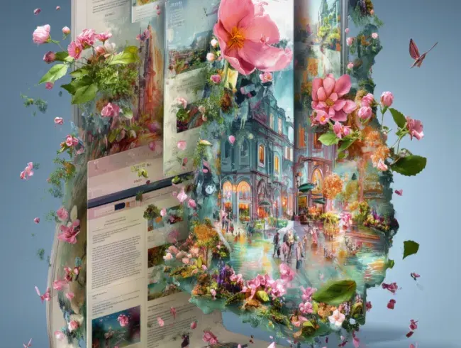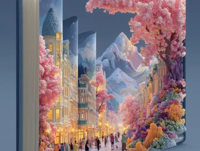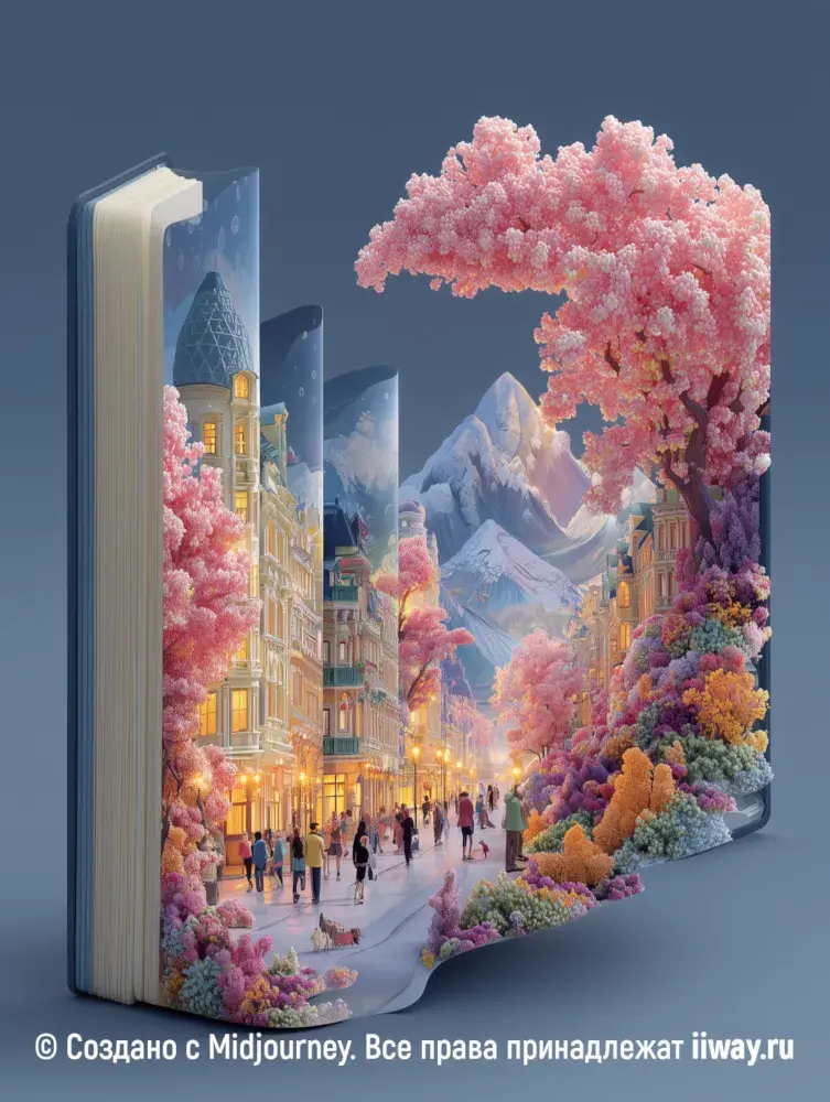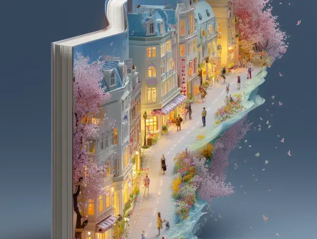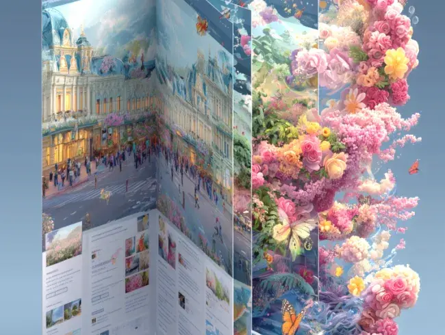 Создать цифровое изображение в виде 3D-открытой книги (монитора, дисплея), страницы которой разлетаются или плавно изгибаются и словно оживают, высвобождая элементы городской уличной сцены и цветочные объекты. Визуализация должна сочетать реалистичные изображения зданий и людей с художественными природными элементами, создавая эффект перехода от плоского изображения к объёмному живому пространству.