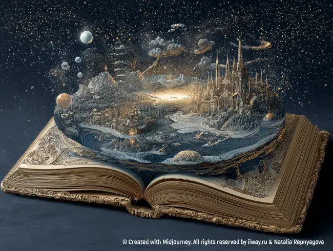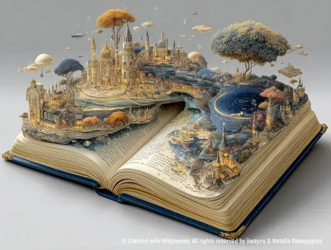 - Текст и мелкие элементы на страницах должны быть читаемы, но не отвлекать от главного акцента — перехода между реальностью и фантазией.