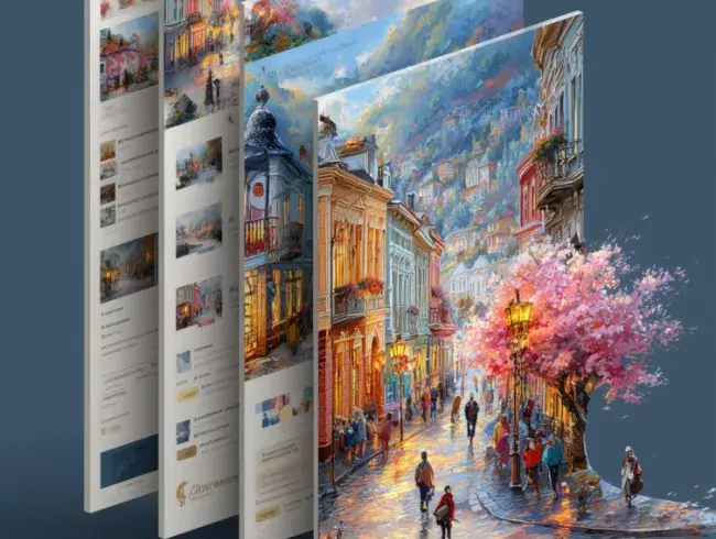 - Городские пейзажи на страницах: современные и исторические здания, открытые улицы с пешеходами и активной городской жизнью.