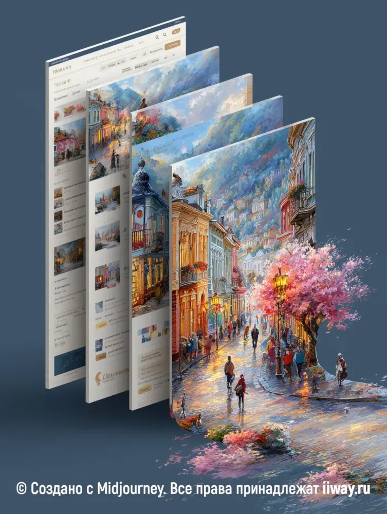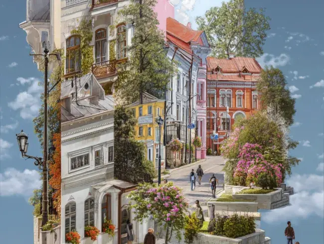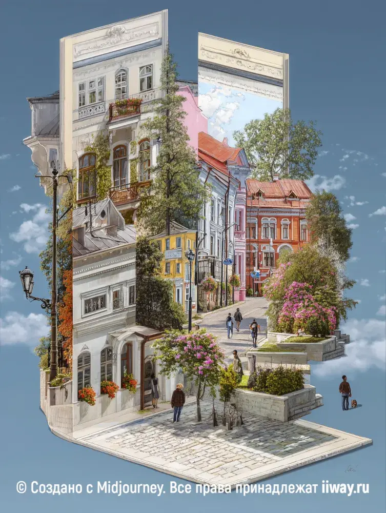 - Тёплые пастельные оттенки зданий и одежды людей.