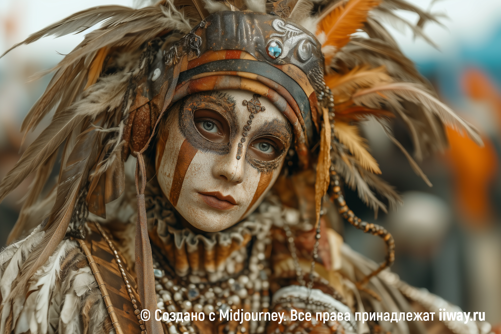 Создать портретное изображение девушки с тщательно проработанным художественным гримом, стилизованным под маску, выполненной с этническими и шаманскими мотивами. Визуализация должна передавать атмосферу мистики и древних традиций, подчеркивая детали украшений и выразительность образа.