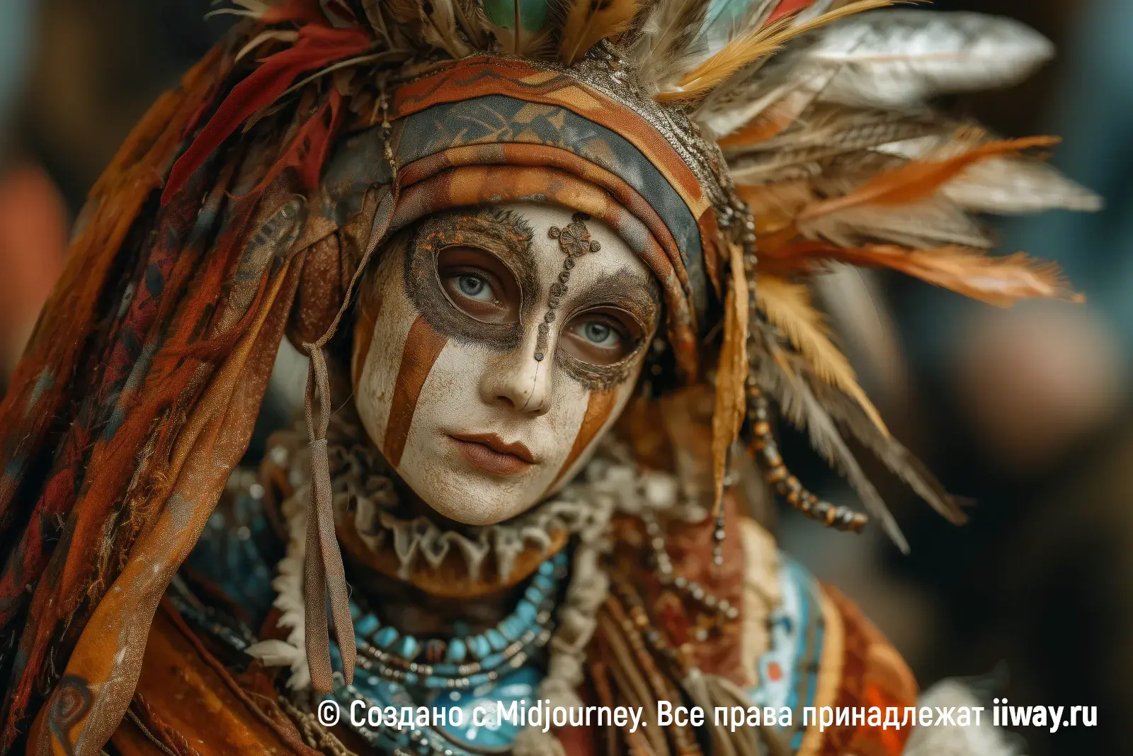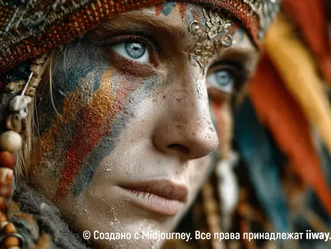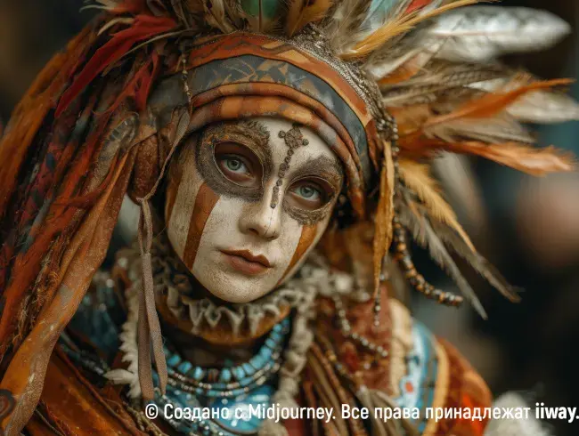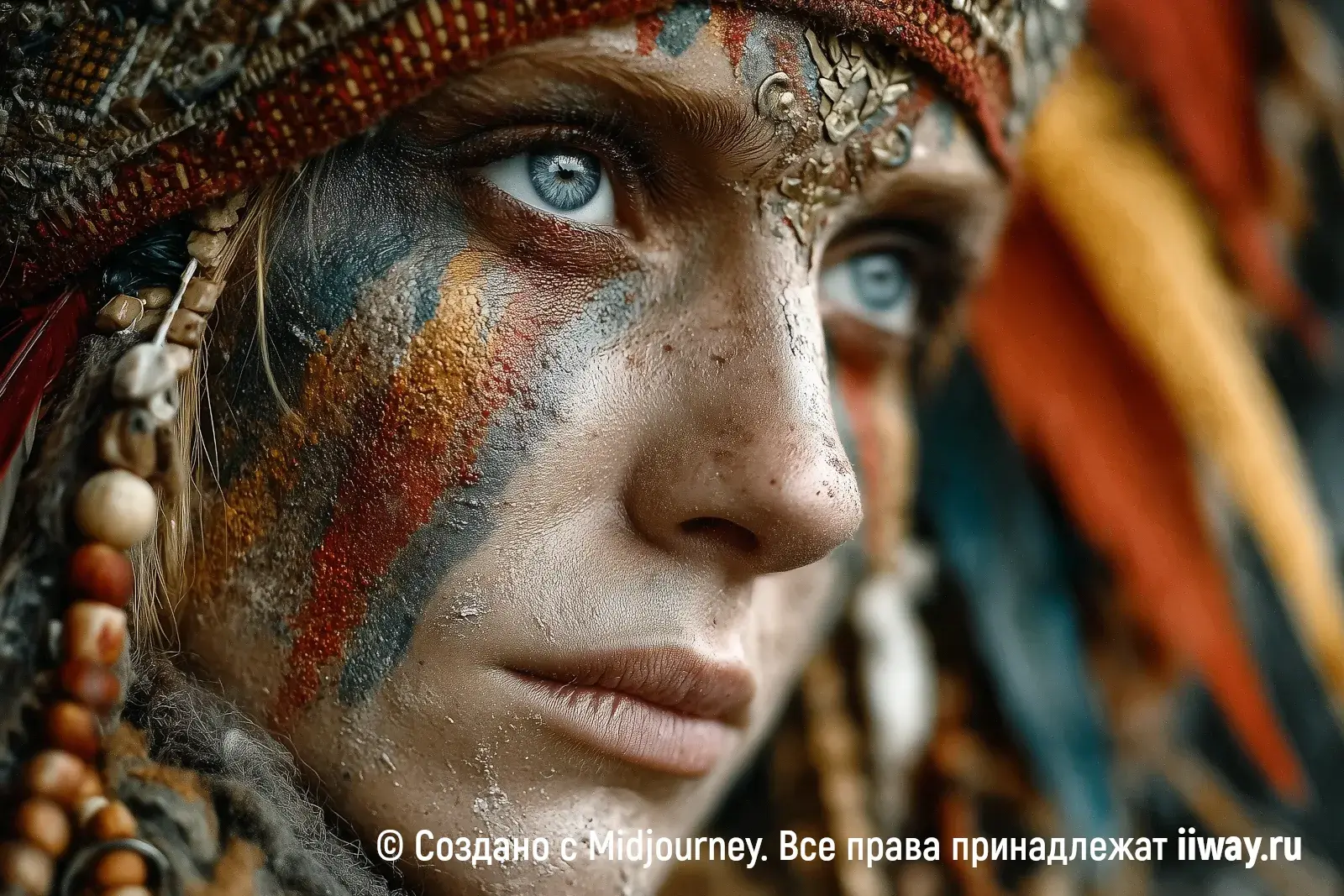 Создать выразительный и насыщенный портрет с элементами этнического стиля и художественного грима, создавая мистическую атмосферу и сильный визуальный образ.