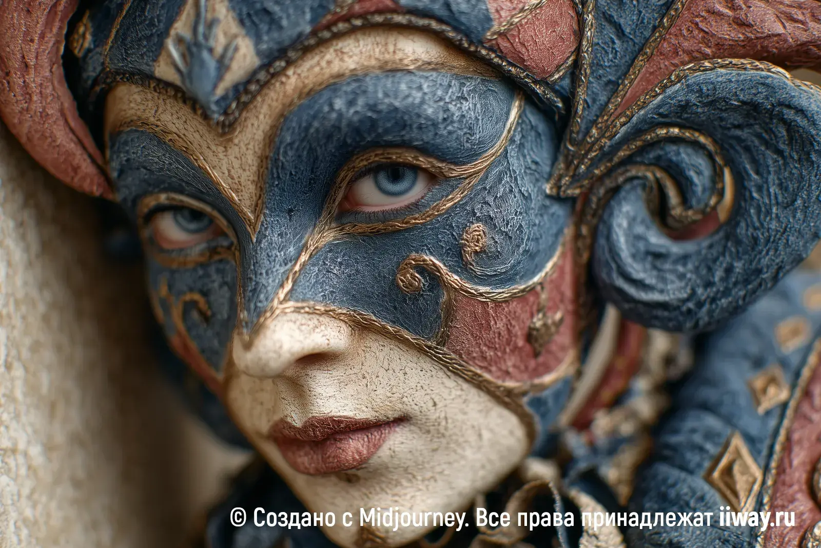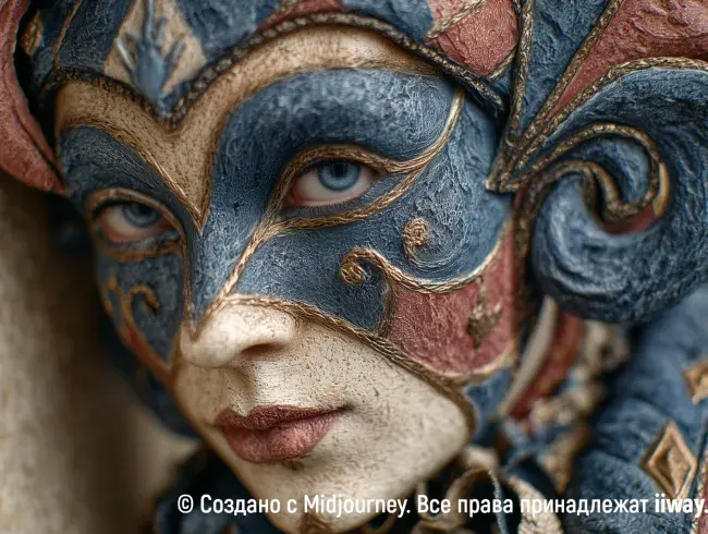 - Лицо девушки покрыто гримом/маской с использованием природных оттенков коричневого, оранжевого и оттенков земли, с детальной проработкой текстур и узоров.
