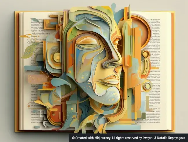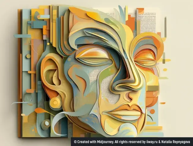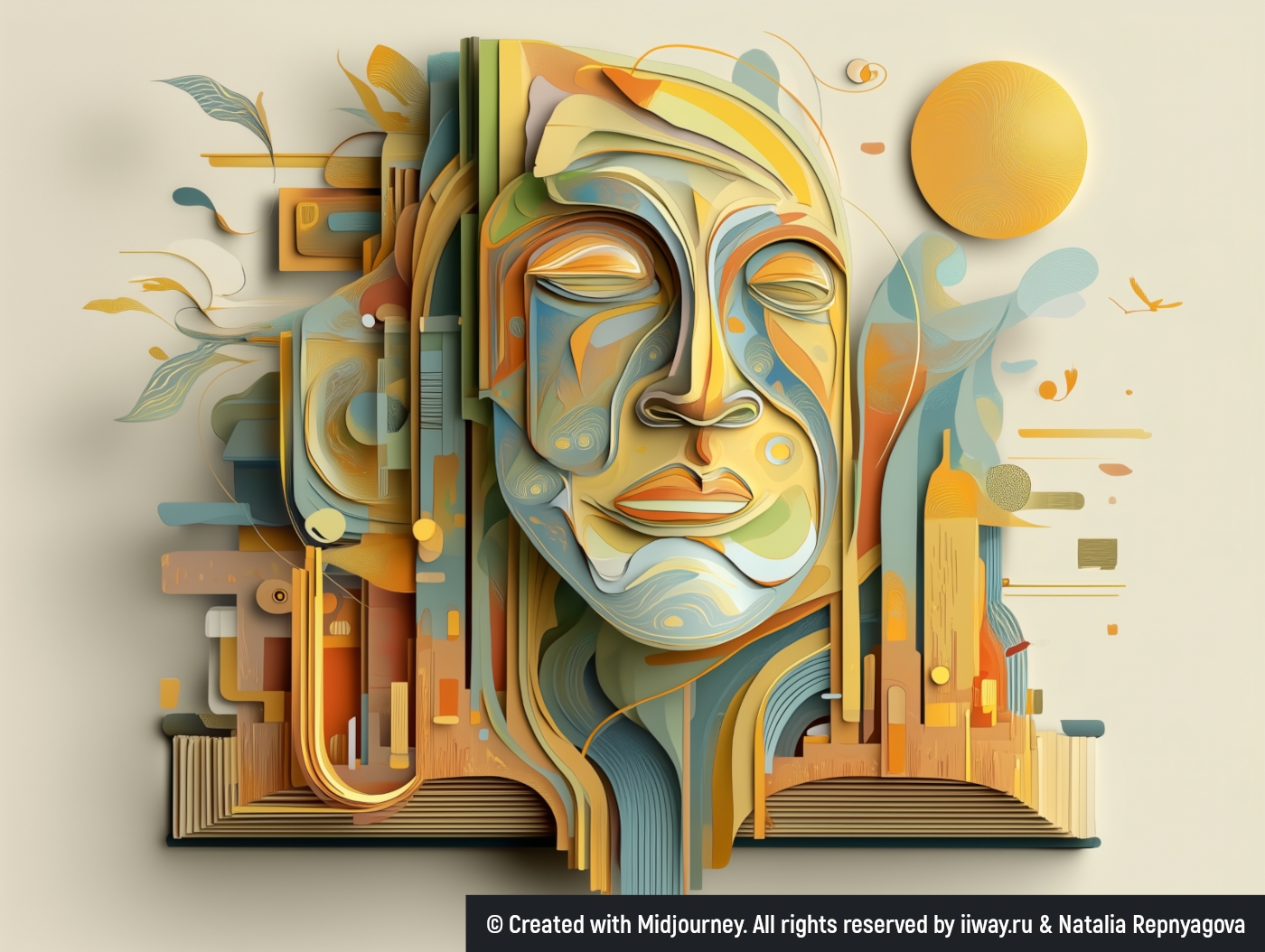 Центральный элемент — крупный профиль лица, выполненный в плавных, плавно переходящих друг в друга геометрических формах и теплых пастельных оттенках (желтый, оранжевый, голубой, бежевый). Линии и завитки придают ощущение текучести и глубины.