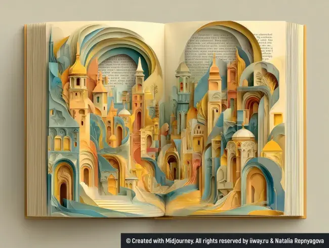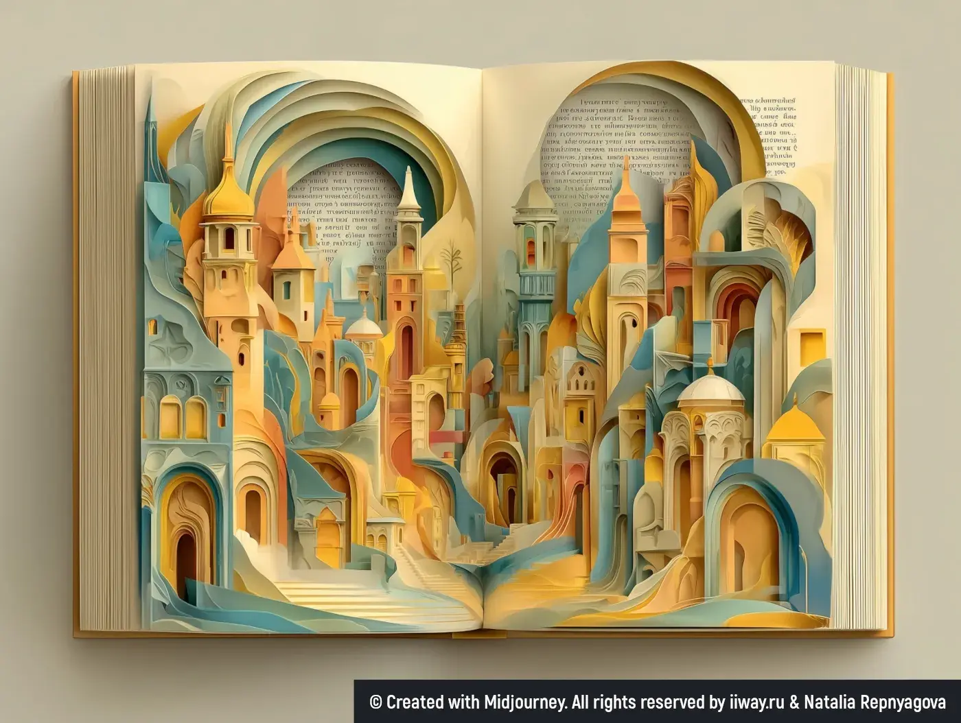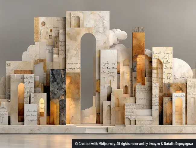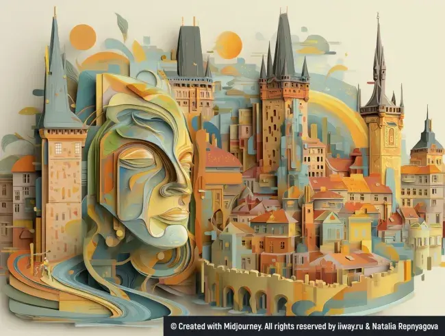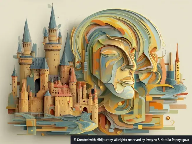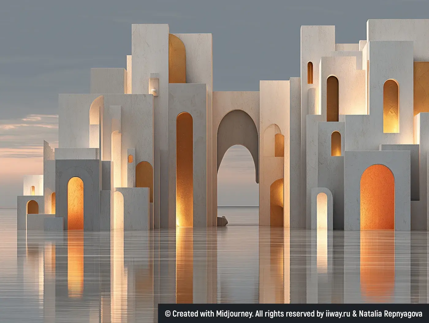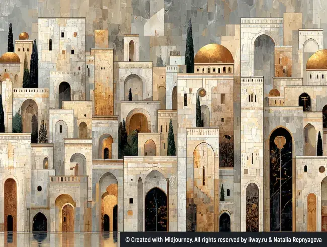 Изображение вобрало мотивы арабской (и, в целом, восточной) архитектуры с ее характерными башнями, арками и узорами, а также стилизацию традиционного орнаментального искусства и палитру теплых земляных и песочных оттенков, типичных для этого региона.
