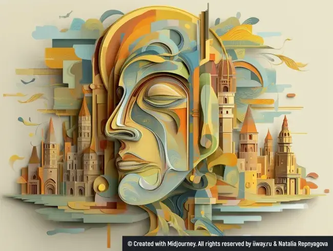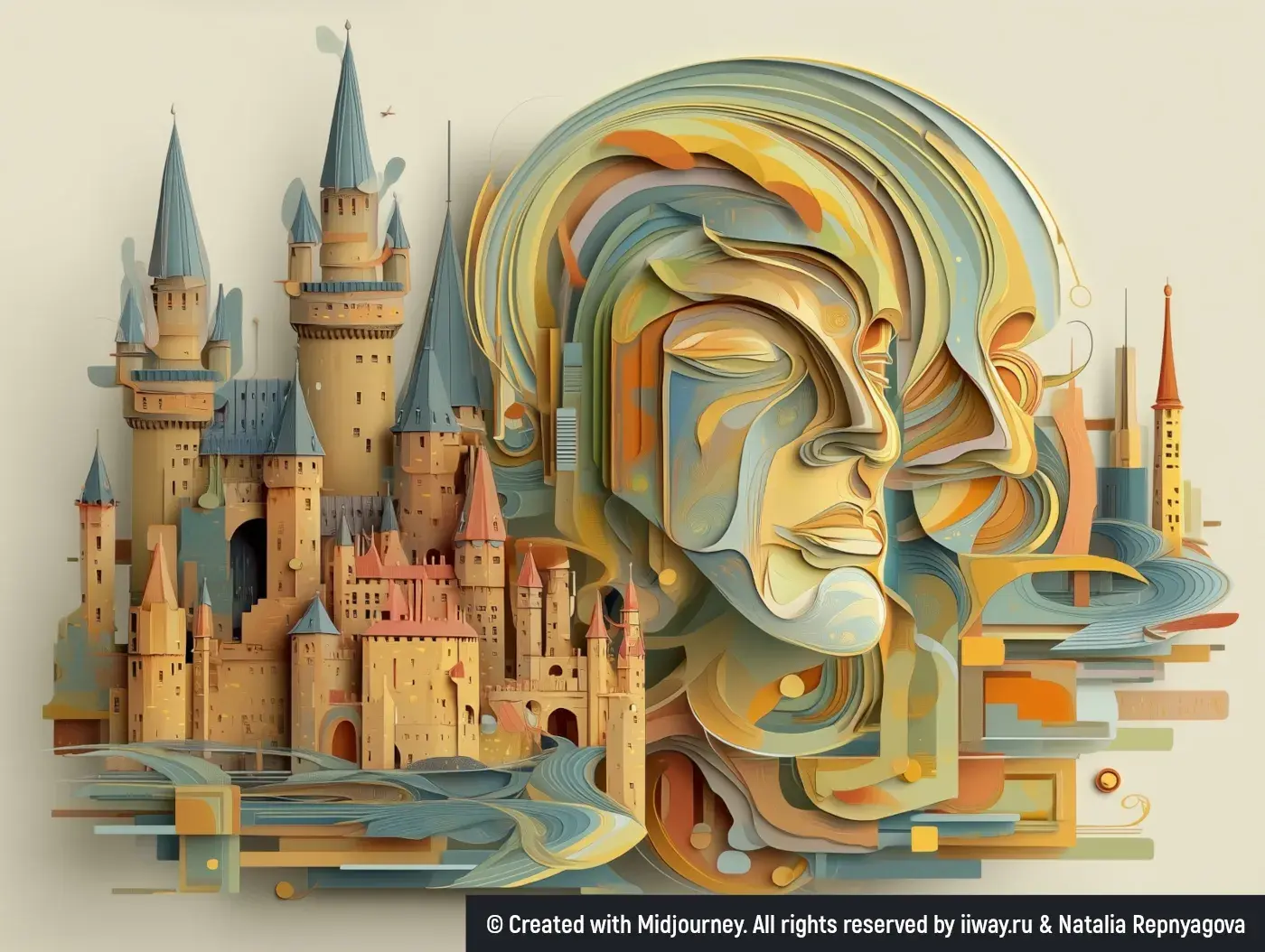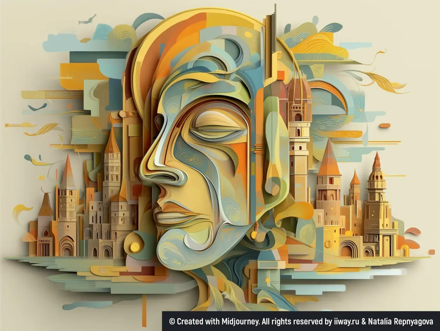 Изображение выполнено в стиле абстрактного искусства с сильным влиянием архитектурных и культурных мотиваций.